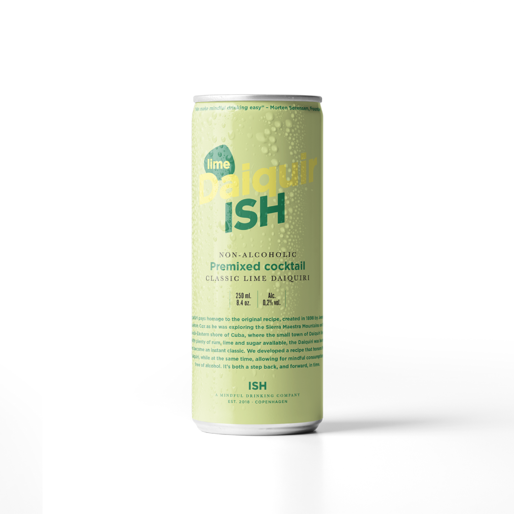 En new school take på en old school-klassiker, minus alkohol selvfølgelig. Produsenten har brukt utallige timer på å utforske den rette blandingen av de tre, og fikk til slutt den perfekt balanserte søte og syrlige cocktail-opplevelsen. Daiquiri er vanligvis en short drink, så hver boks med DaiquirISH serverer to, perfekt for deling, eller bare to cocktails, for som vi vet kan man drikke så mange man vil av denne og likevel stå opp frisk og opplagt dagen derpå.